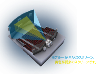 まず、劇場に入って驚かされるのは、あまりにも大きなスクリーン。床から天井、さらに左右の壁までにいーーっぱいに広がっています。しかも従来のスクリーンよりも、観客席にかなり近い。その上、観客を包み込むようにカーブしているので、映像に包まれて作品の中に入ってしまったような錯覚をおぼえるほど。このスクリーンが圧倒的な迫力と、没入感とを与えてくれます。気づけばそこは映画の中!